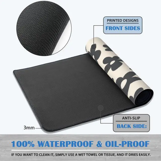 • Soft and Non-slip Rubber BaseThe soft and dense non-skid nature rubber base keeps the pad firmly in place,it can effectively prevent the mouse and keyboard from sliding and moving for stable operation.The desk pad is flexible enough to be rolled up for easy transport, to move around so you can work or game wherever you want.