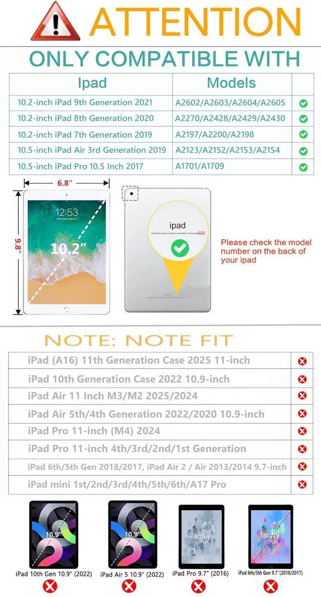 Compatibility-- Vimorco for iPad 10.2 / 10.5 Inch Case for iPad 9th Generation case 2021(A2602/A2603/A2604/A2605), for iPad 8th Generation case 2020(A2270/A2428/A2429/A2430), for iPad 7th Generation case 2019(A2197/A2200/A2198). Also fit for iPad 10.5 Pro Case 2017(A1701/A1709) and for iPad Air 3rd Generation 2019(A2123/A2152/A2153/A2154).