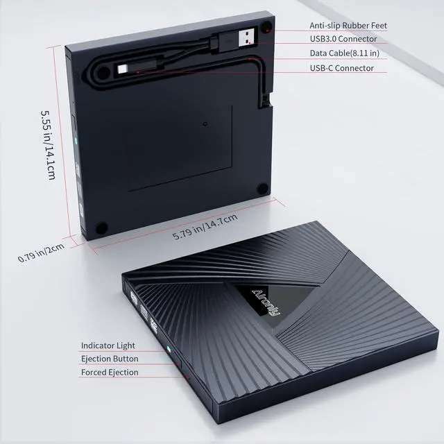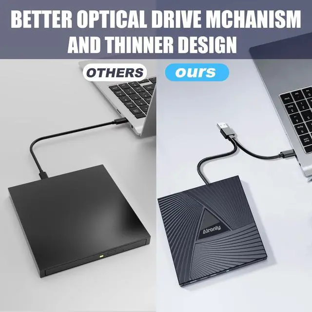 Portable and Lightweight: Our optical drive stands out with its exceptional portability and lightweight design, measuring just 0.79 inches thick and weighing only 0.55 pounds. It easily fits into your handbag or backpack, making it perfect for use at the office, home, or on the go. Made from high-quality materials and featuring a sleek, minimalist design, this external cd/dvd drive is not only stylish and durable but also incredibly convenient. It supports multiple disc formats, offering you a seamless digital experience. Choose our optical drive and let portability and lightness become your trusted companions ^^ Thoughtful service, thoughtful