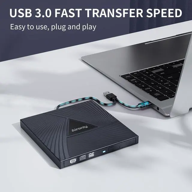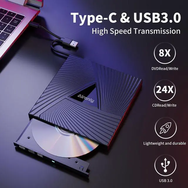 Experience High-Speed Read/Write: This Type-C & USB 3.0 external CD/DVD drive delivers blazing-fast performance with up to 8x DVD rewrite/read speed and 24x CD write/read speed. Leveraging dual Type-C and USB 3.0 connectivity, it achieves maximum 5Gbps data transfer rates ensuring seamless playback of music and movies, smooth software/system installation, and error-free disc burning ^^ Plug and play, no