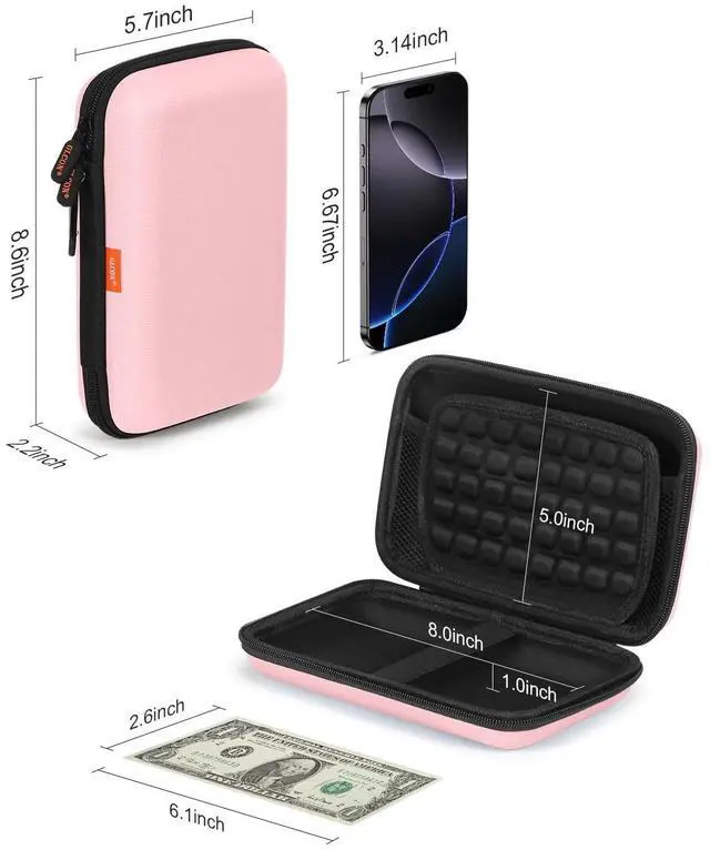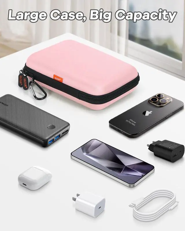 Shockproof Hard Shell Carrying Case for External Hard Drive, Power Bank, Charger, Cable, Heart Monitor, Cell Phone, Electronic Accessories - Larger Capacity Storage Pouch Travel Bag - Light-Pink
