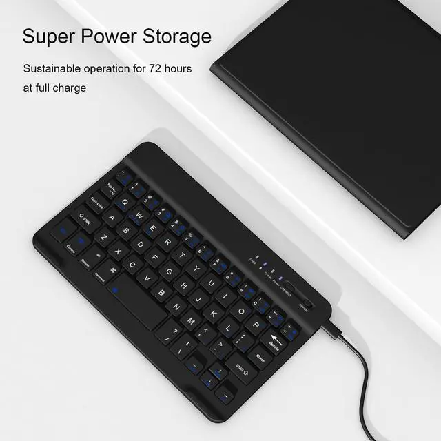 Long Life Battery&Rechargeable Slim Bluetooth Wireless Keyboard&Instant pairing- With its powerful 500mAh battery,2-3 hours full charge, work for more than 80 hours, stand by for 130 days. It even enters into sleep mode automatically if not in use for 15 minutes. Just Press any key to wake up.Mechanical scissors keyboard, quick rebound, press smoothly.