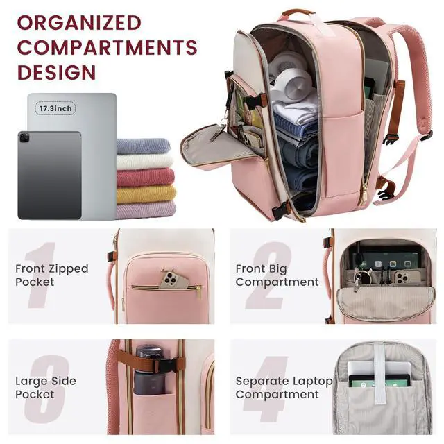 Perfect for storing wet clothes, towels, and toiletries, these packing accessories ensure your belongings remain dry and prevent any leaks or moisture from affecting your other items. ^^ Durable & ComfortableBuilt to withstand the challenges of travel, this carry on backpack is made from tear-resistant, water-resistant, and abrasion-resistant materials. It also has adjustable shoulder straps, a padded back panel, and shoulder straps, ensuring comfort during long trips; a travel essential. ^^ Secure & PracticalThis large travel backpack features a suitcase-style opening for easy access to your belongings at security checkpoints.