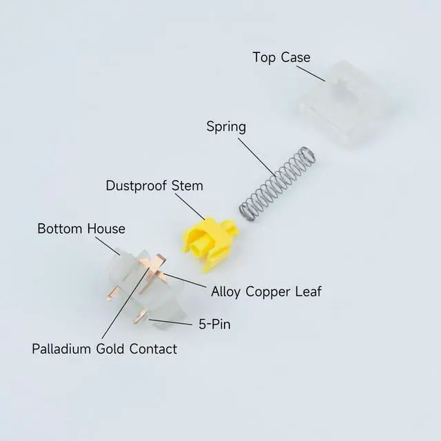 Gaming Grade Performance Corelinear switches are made of alloy copper and palladium contacts, providing better conductivity, stability and durability. Dust-proof core and 5-pin design, 50gf gold trigger force 0.2 ms fast response gaming/office scenarios can be controlled accurately, and the tactile keyboard switches provide a soft and responsive feel, allowing you to always be in control of the situation without feeling fatigue. ^^ Hall of Fame Smooth ExperienceEach linear keyboard switches are pre-lubricated at the factory, from the first press you can feel a creamy smooth, frictionless key experience, keyboard switches special structural design can be self-lubricating while in use, innovative POM material core + self-lubricating structural design + 60 million times Innovative POM material core + self-lubricating structure + 60 million keystrokes life span guarantee, ensuring long-lasting and stable performance in endless game battles and high-intensity typing workloads.