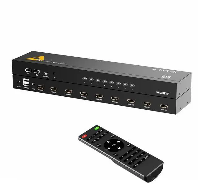 KVM Switch 1 Monitors 8 ComputersArvitek HDMI KVM Switch with 8 HDMI ports allows control of 8 computers, enabling them to share a single monitor along with keyboard and mouse. It's complete USB switch and HDMI switch rolled into one. This KVM Switch also supports various input devices such as PCs, Laptops, PS4, etc. It is compatible with various operating systems including Windows 7/8/10/11/Vista/XP, Linux, Mac, and more. ^^ 4K Resolution & HDCP 2.2S upports up to 4K@60Hz resolution, delivering sharp, detailed, and vibrant visuals.