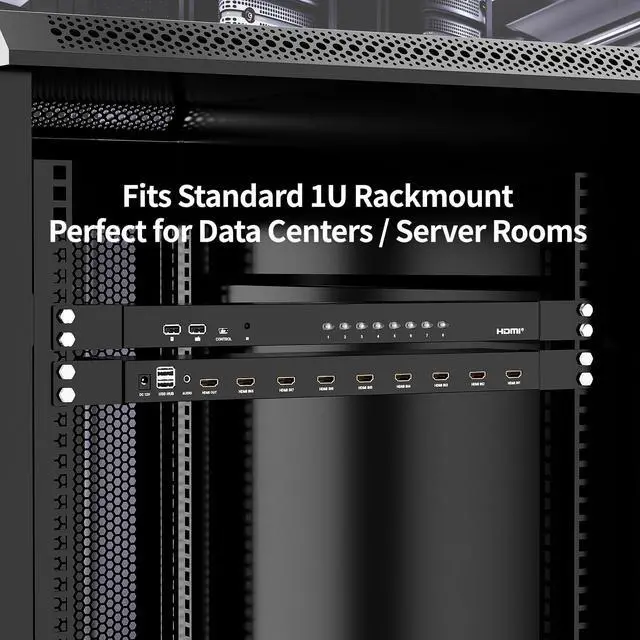It is fully HDCP 2.2 compliant, allowing seamless playback of protected 4K content without signal loss or flicker. Compatible with 4K@30Hz, 2K, 1080P, and 3D formats, it provides flexible display options for a smooth and secure viewing experience. ^^ 3 Ways of Switching4K HDMI KVM Switch offers three switching options: front-panel button, wired desktop controller, and IR remote control. The remote controller allows you to place the KVM switch in a hidden or distant location while keeping your workspace clean. Simply keep the controller within reach on your desk for quick and seamless switching between computersimproving workflow and reducing desktop clutter. ^^ Audio & Display OptimizationFeaturing Adaptive EDID technology, this HDMI KVM switch ensures smooth, stable video output and synchronized, high-fidelity 3.5 mm stereo audio. Easy to install with plug-and-play designno driver or power adapter needed. Connect and start working seamlessly between two computers and one monitor ^^ 4 USB 2.0T his KVM switch features 4 USB 2.0 ports with data transfer speeds up to 480 Mbps, allowing seamless sharing of peripherals such as printers, scanners, and flash drives among connected computers. It automatically detects and matches connected USB devices for smooth operation, reducing clutter and improving efficiency. ^^ Packing ListThe package includes everything you need for seamless setup: 18 Port HDMI KVM Switch unit; 8HDMI KVM Cables; 1Desktop controller; 1DC12V Power Supply; 1User Manual; 2Mounting ears; 1Floor mat.