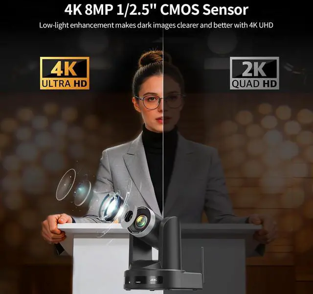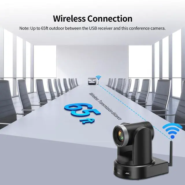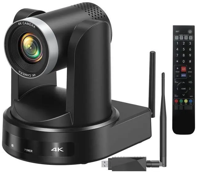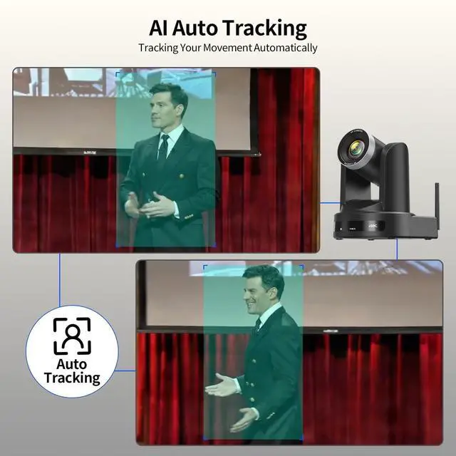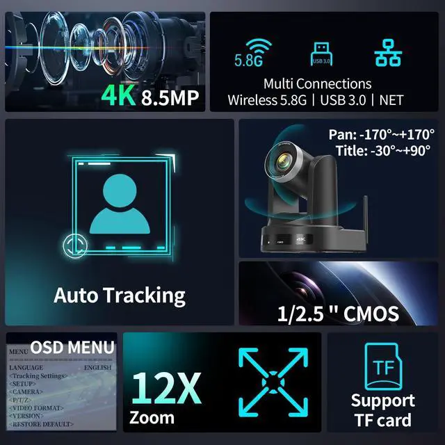 Wireless & Wired 4K PTZ Camera with AI Auto Tracking, Video Conference Camera, 12X Zoom, Auto Light Correction, Wireless / USB 3.0 / LAN, Support TF Card, PTZ Camera for Church, Worship, Education, Conferences, Online Video Conference, Works with Zoom, Microsoft Teams, Livestream OSB, Vmix, OBS, Youtube and more, Easy Setup