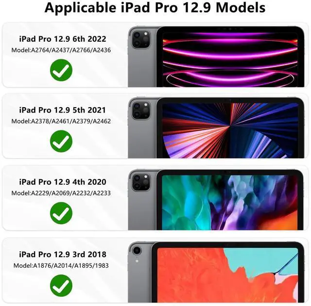 [iPad Pro 12.9 inch Keyboard Case Compatibility] This iPad Pro keyboard case is designed for 12.9 in iPad Pro 6th Generation 2022 (Model Number: A2436/A2437/A2764/A2766), iPad Pro 5th 2021 (models: A2378/A2379/A2461/A2462)/ 4th 2020 (models: A2229/A2069/A2232/A2233)/ 3rd 2018 (models: A1876/A1983/A1895/A2014). Please check the model number on the back of your iPad before purchasing.