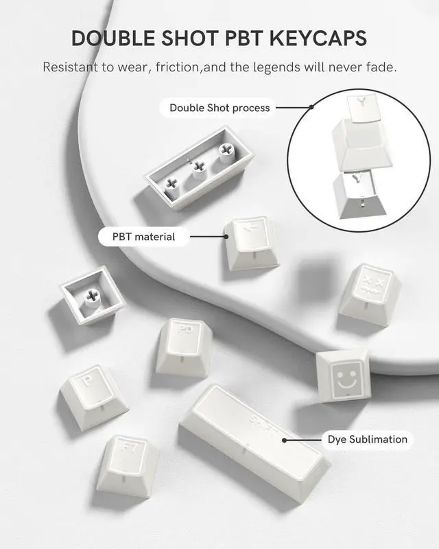 Double Shot ConstructionThese keyboard keycaps are crafted with two-color injection molding, ensuring the legends remain sharp, clear, and resistant to fading. The durable PC+ABS material provides long-lasting use, making them reliable custom keycaps for daily typing and gaming. ^^ Chreey Profile DesignFeaturing a unique chreey height, this creamy keycaps profile offers a balanced typing feel with comfortable ergonomics. The sculpted layout delivers improved hand positioning and a more satisfying keystroke sound. ^^ Elegant White Jade LookDesigned with a smooth jade-like finish, these cute keycaps add a refined, minimal aesthetic to your setup.