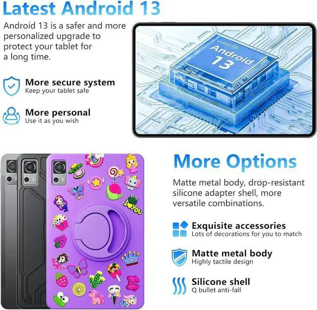 High-Performance Kids TabletThis Android tablet is equipped with a ARM high-performance 8-core CPU that has a frequency operation of up to 2GHz and can run multiple programs smoothly and handle multi-threaded tasks perfectly. Pre-install Android 13 OS with Google Mobile Service support, which can be easily operated by both kids and all age groups.