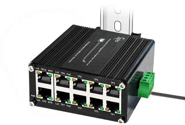 ^^ Built with an IP40-rated aluminum housing, this switch offers 6KV lightning protection and operates in extreme temperatures from -40C to 80C (-40F to 176F). Designed for harsh industrial and outdoor environments. ^^ Compact size ( 3.74 x 3.5 x 1.81 inches) with tightly arranged RJ45 ports, making it ideal for space-constrained installations. Supports DIN-Rail mounting for easy deployment in control panels or industrial racks.