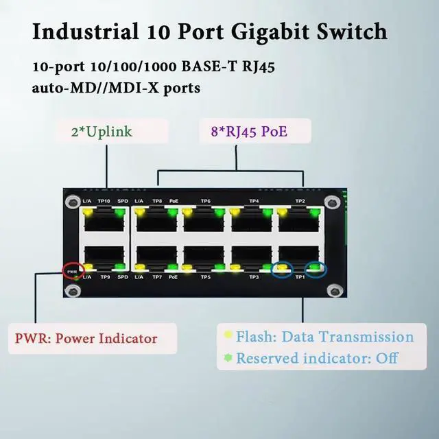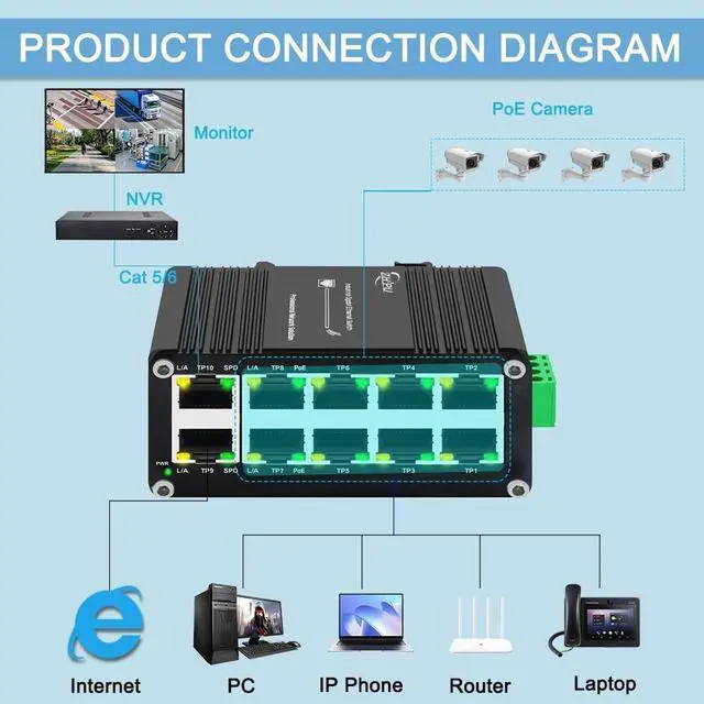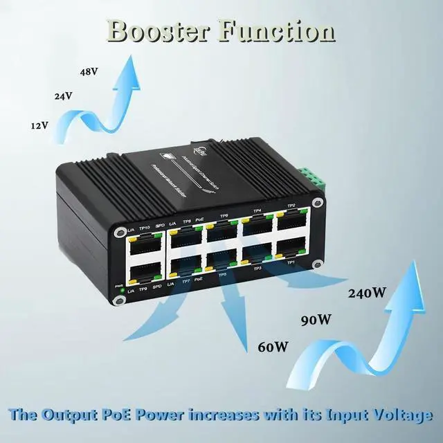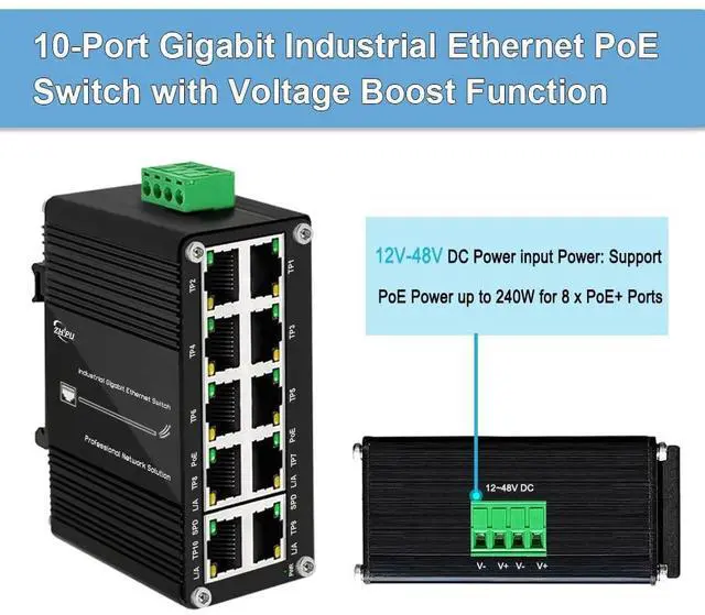 Features 8 PoE+ 10/100/1000 Mbps RJ45 ports and 2 Gigabit uplink ports, connectivity. Perfect for connecting IP cameras, wireless access points, and NVRs with high-speed data transfer. ^^ Supports 12~48V DC input with a voltage booster function, delivering up to 240W PoE budget (48VDC). Ideal for powering multiple devices like CCTV cameras, VoIP phones, and IoT devices in industrial settings. ^^ Compliant with IEEE 802.3 af/at PoE+ standards, providing up to 30W per port to meet the power needs of most PoE devices. Ensures reliable power delivery for surveillance systems and wireless networks.