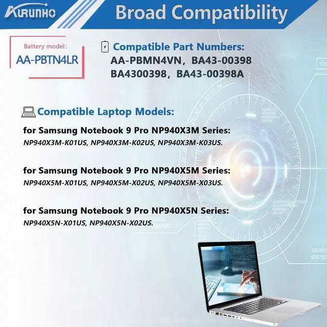 Color: Black. 100% brand New from Manufacturer. ^^ Fits Modelsfor Samsung Notebook 9 Pro NP940X3M Series, for Samsung Notebook 9 Pro NP940X5M Series; for Samsung Notebook 9 Pro NP940X5N Series. ^^ Compatible P/N AA-PBTN4LR BA43-00386A AA-PBTN4LR-05 ^^