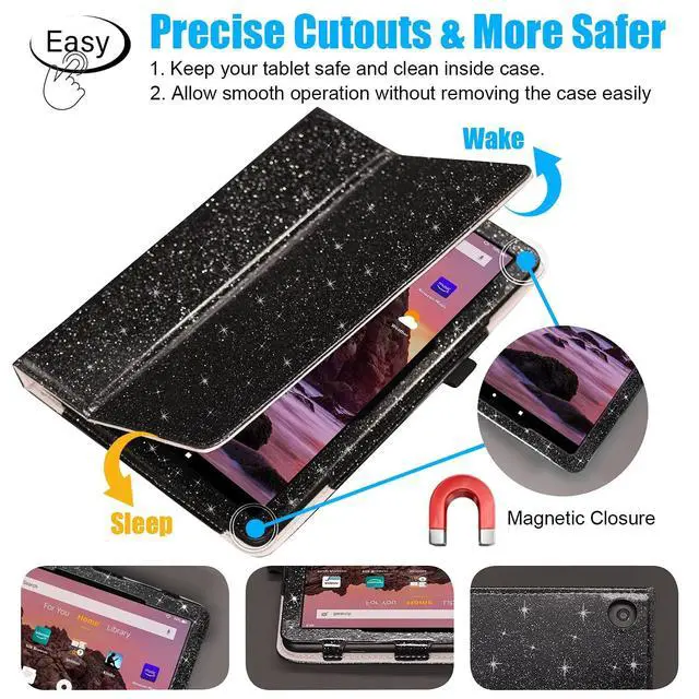 COMFORTABLE FEATURES: Our 10 inch tablet case has a magnetic strip built-in, it allows your tablet to automatically wake up or go to sleep when the lid is opened and closed. This tablet cover has 2 card pockets on the inside to keep your essential cards or cash safe. The tablet case features a hand strap on the back, so you can hold it more easily. Our Fire 10 tablet case has a convenient pen holder, so you can securely store your stylus or pen in there while not using it. ^^