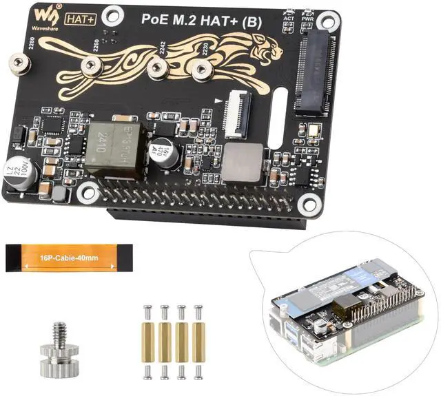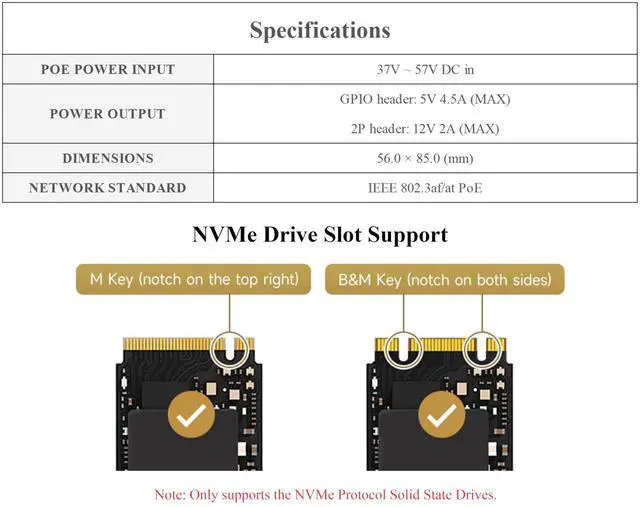 The POE M. 2 HAT+ (B) is a combination of Power over Ethernet (PoE) and PCIE to M. 2 which is compatible with Raspberry Pi 5. And it supports the IEEE 802.3 af/at networking standard. ^^ Support NVMe Drive Protocol, Compatible With 2230 / 2242 / 2260 / 2280 Size M. 2 Solid State Drive. Supports Gen2 and Gen3 Modes, Supports Booting PI5 From Solid State Drive. Supports NVMe protocol M. 2 interface hard drives, featuring high-speed read and write, and high work efficiency. ^^ Power Over Ethernet, providing both network connection and power supply for your Raspberry Pi in one cable.