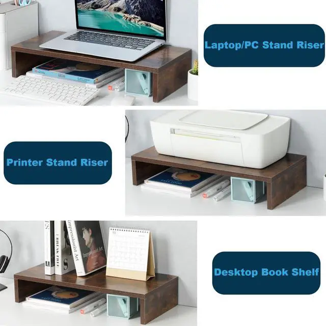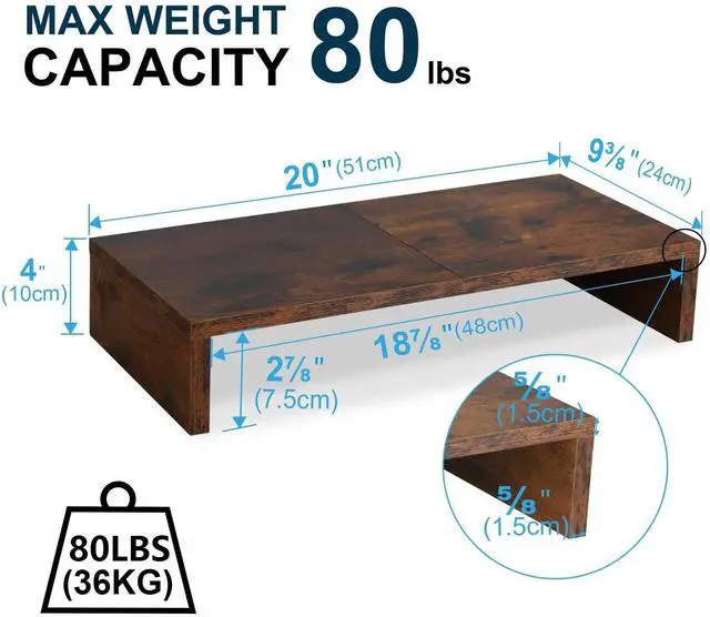 Great Basic Shelf Multi-function Stand can be match Laptops less than 20 inch & Most of screens less than 50 inch, it provides storage area for keyboard notebook and anything when not in use. You can use it according to your creativity. ^^ Ergonomic Design Helps reduce eye, neck, and back strain related to computer work and provides you a healthier working environment. ^^ Better SupportStand can hold 80Ibs, there is a thick steel pipe stabilizing support structure on the back avoid shaking. TEAMIX monitor riser made of high quality MDF wood board, strong and sturdy.