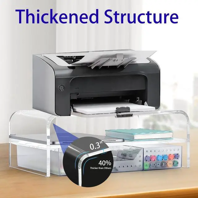 Ergonomic DesignOPNICE newly releases the monitor stand for desk organizer! This computer stand elevates your monitor or laptop to a comfortable viewing height, relieving pressure on your neck, shoulders. Ideal for strengthening office organization and increasing comfort levels ^^ Save SpaceThis 2-Tier monitor stand with drawer provides ample storage space to keep your office supplies and office desk accessories neatly organized and easily accessible, keeping your workspace tidy and improving your sense of well-being ^^ Durable and StableThe crystal-clear acrylic computer stand is made of high quality material with sturdy construction, it can easily carry the weight of the display and computer accessories, to ensure stable and non-shaking for a long time, ideal for use in the office, dorm room or home ^^ Sleek and AestheticThis desktop organizer features a modern minimalist design that blends seamlessly with any office decor.