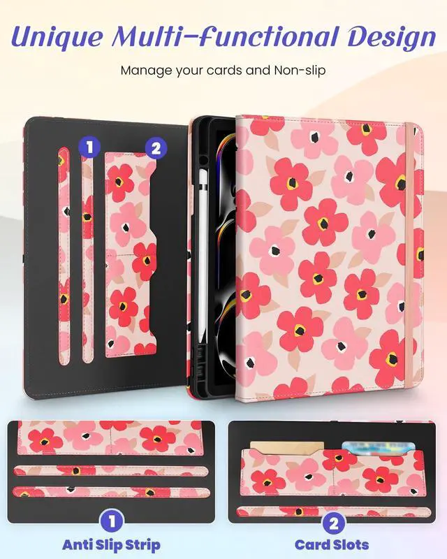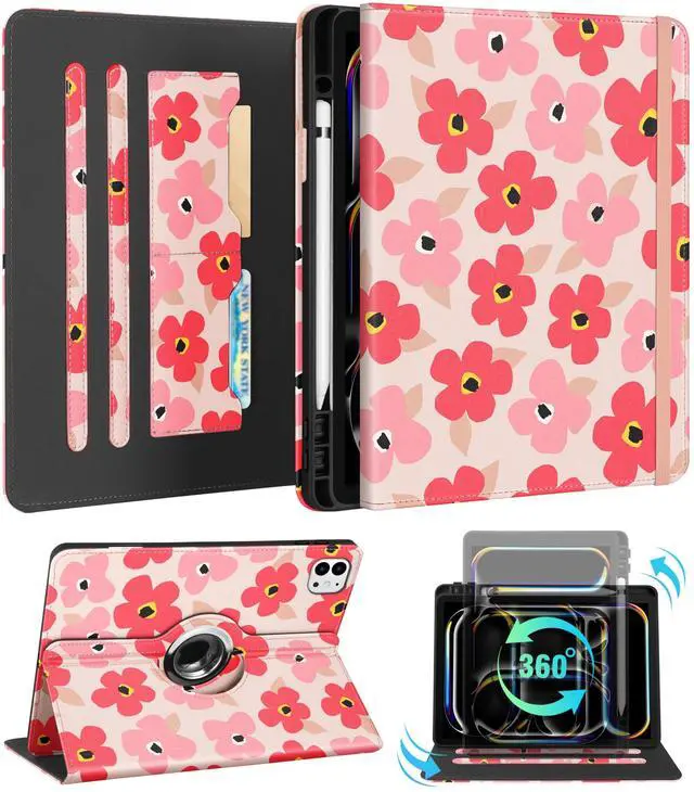 Kidcube for iPad Pro 13 Inch Case M4 2024 - Women Girls Cute Rotating Stand Folio Cover with Pencil Holder & Card Slot Kawaii Floral Flower Design for iPad Pro 13 Inch Case 2024 (A2925 A2926 A3007)