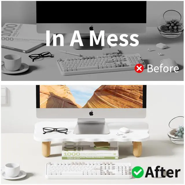 Ergonomic DesignFeatured ergonomic design, AFOOYO monitor stand raises your monitor screen to a comfortable eye level (about 3.2 inches) for relieving stress on the neck, shoulders and back, and improving work efficiency. ^^ Upgraded Exclusive DesignA cute Cookie-Shaped panel with 4 cylindrical beech feets, adds a rustic and unique look. Silicone non-slip pads are pasted on the feet to keep stable even while working. The feet and panels are finely polished, and the quality is cost-effective. ^^ Space Saving &StorageGet rid of the messy desks! It allows for organizing office supplies and accessories, adding hanging pen holders for easy access, making the work environment more efficient and tidy ^^ Heavy Duty StandDimensionL 16.5 x W 7.8 x H 3.2 inch.