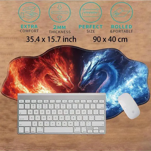 ZHJLZQAI Large Extended Gaming Mouse Pad XXL 31.5x15.75 in,Kawaii Aesthetic Mousepad,Laptop Keyboard and Mouse Mat for Women Office Gamer Girl Decor,Ice and Fire Dragon