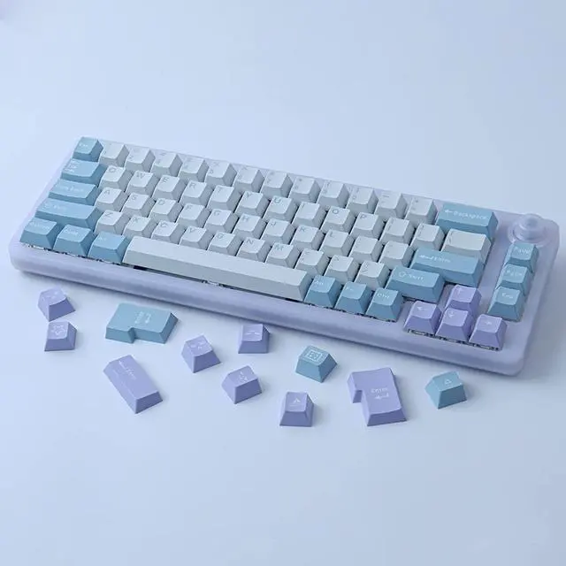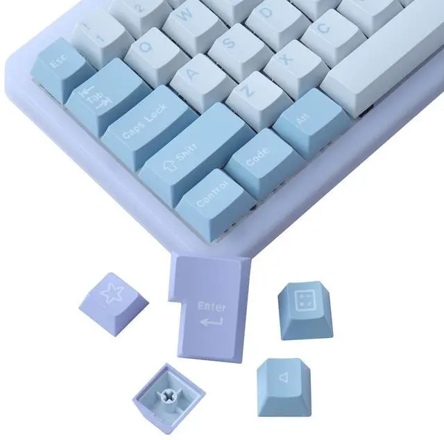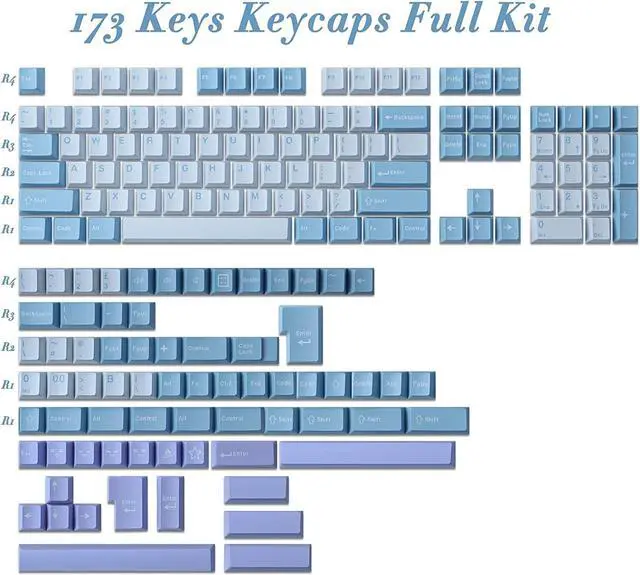 Double Shot KeycapsThese keycaps adopt the double-shot technique, a more complicated manufacturing process. The keycaps produced will not have problems such as uneven dyeing or bending of the keycaps. Ultra-high production technology brings high-quality keycaps ^^ ISO/ANSI LayoutThis set of keycaps has 173 keys. Includes standard 108 ANSI layout keycaps, large enter key, and 7U, 6.25U spacebar for ISO layout. Our keycaps do not fit Razer, Logitech and Corsair mechanical keyboards. ^^ Cherry Profile KeycapsThese keycaps use luxurious and sophisticated craftsmanship to create the character of a clear keycap font.