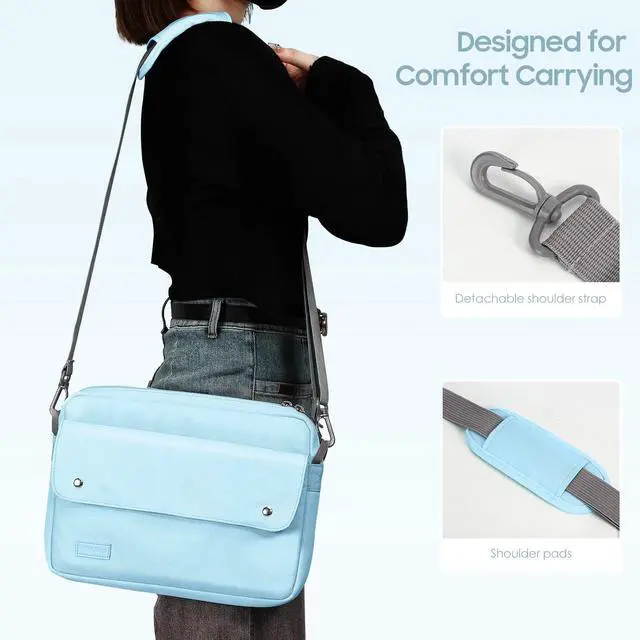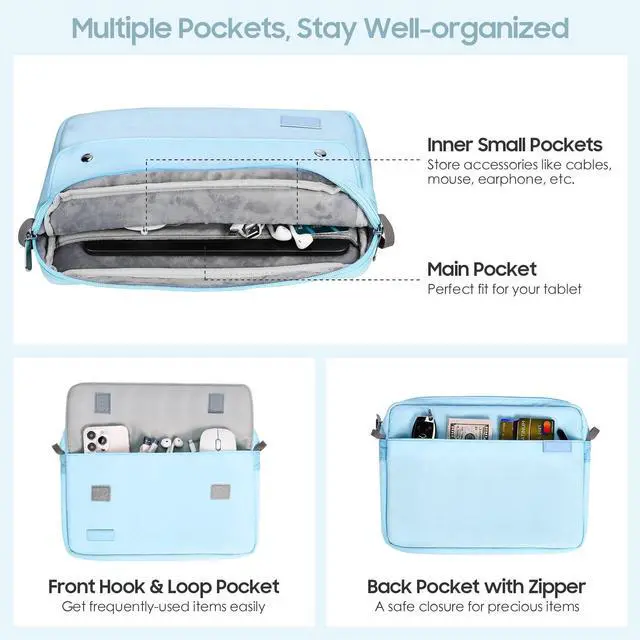 Thickened cushioned inter layer provides excellent protection against damage to the inner items during daily carrying. ^^ Large CapacityThe tablet sleeve has multiple compartments: 1 x main compartment to keep your tablet, 2 x small compartments for accessories like cables, mouse, earphone, wallet, cards and others. 1 x outer pocket to store your daily small items such as tissues, pens, notes, etc. 1 x hidden back pocket for your valuables and prevent loss. ^^ Portable DesignComes with a convenient shoulder strap, which is detachable and adjustable, allowing you to carry outside easily. Perfect for on-the-go, business or travel. Slim and lightweight sleeve easily fits in your briefcase, backpack, suitcase, etc, and will not add too much burden.
