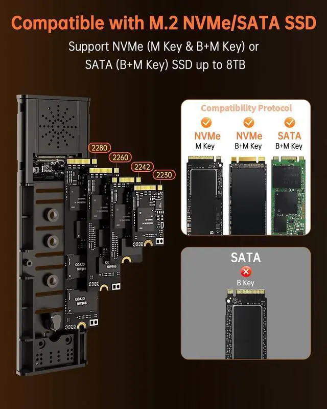 Dual-Protocol M. 2 SSD EnclosureThis M. 2 SSD enclosure supports both NVMe PCIe and SATA protocol M. 2 SSDs with auto-detection. compatible with M. 2 NVMe PCIe SSD (M-Key/M+B Key), compatible with M. 2 SATA SSD(M+B Key). Supports standard sizes including 2230, 2242, 2260, and 2280 (up to 8tb) one ssd enclosure for multiple SSD formats.