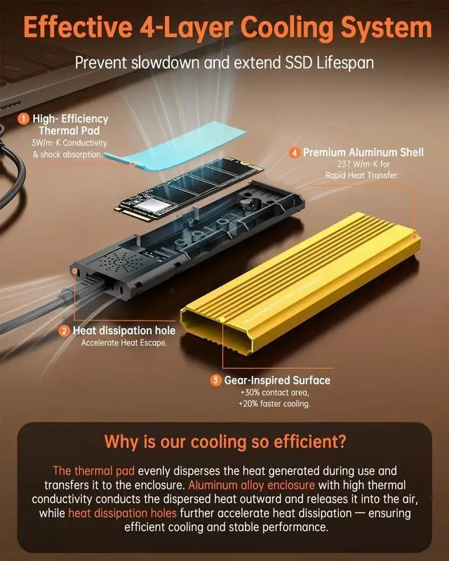 Note: For a new SSD, make sure it has been partitioned and formatted before first use. Not compatible with mSATA SSDs. ^^ Fast Transfer SpeedThis M. 2 SSD enclosure adopts USB 3.2 Gen 2 Type-C interface, supports data transmission speed of up to 10Gbps (SATA for 6Gbps). The ssd adapter supports USB 3.2 / 3.1 / 3.0 / 2.0 interfaces. Equipped with the RTL9210B main chip, it supports UASP and TRIM, improves data transmission efficiency, maintains the service life of solid state drive, and supports SMART health monitoring. ^^ Excellent Heat DissipationThe 3D line design aluminum alloy shell can increase the heat dissipation area. The silicone thermal pad and aluminum alloy design can keep the normal temperature even after a long time of use, ensure transmission stability and data security. And the bright yellow NVMe reader case is not only beautiful and unique, but also makes it easier for us to quickly find and avoid forgetting or losing it. ^^ Tool-free & PortableSimply insert and use, no need to install drivers, and installation can be easily completed. It is compatible with Windows, macOS, Linux, Android, and iOS systems, and can connect to devices such as computers, laptops, MacBooks, smartphones, game consoles, and televisions.