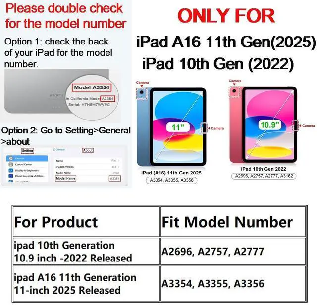 • Specially designed for 10.9 inch 2022 iPad 10th Generation, for iPad 11th Generation (A16 11 inch 2025) - including the following Models: A2696, A2757, A2777, A3354, A3355, A3356