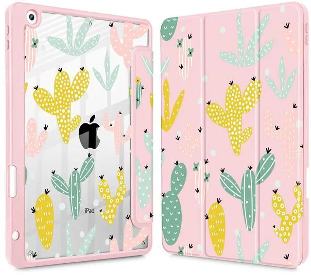 Lepeoac for iPad 9th Generation with Pencil Holder, iPad 8th/7th Gen Case 10.2-inch, [Built in Pencil Holder] Trifold Stand Auto Wake/Sleep Clear TPU Protection Back Cover, Cute Cacti-Pink