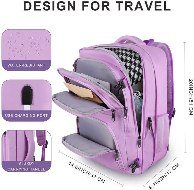 The luggage strap attaches the laptop backpack to your luggage, while the two thick carrying handles provide comfort during use. The anti-theft pocket on the back of the travel backpack is used to store valuables, and backpack compartments of different sizes and functions allow you to store your belongings neatly ^^ Design for TravelThe waterproof travel backpack can help you protect the contents of your bag from damage in light rain. The travel backpack features a USB charging port for charging electronics on the go. Two sturdy carrying handles on the top and sides of the backpack make it easy to carry while traveling. As a large travel backpack, it is the perfect companion for business trips, traveling, hiking and other outdoor activities