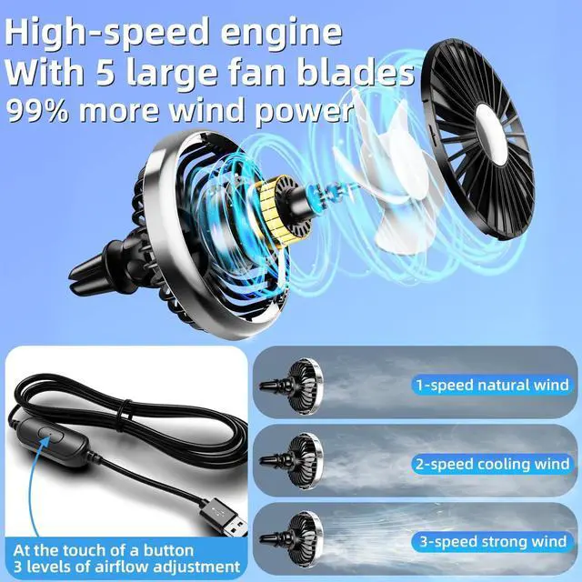 ADJUSTABLE: The USB cooling fan for car has 3 speeds and the fan's 360 adjustable head allows you to direct the air wherever you want it. Place the vehicle fan on the front vents to cool the driver and passenger. Place auto fan for cars on the rear vents to cool your kids and pets!