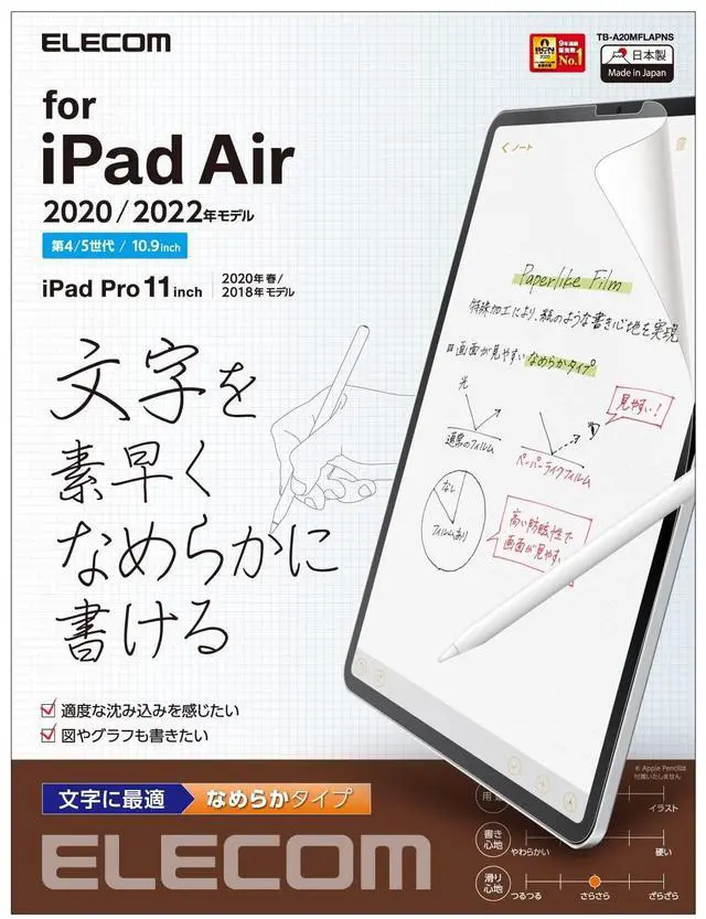 Description iPad Pro 11 Inch (4th Generation) (2022 Model), iPad Air (5th Generation) (2022 Model), iPad Pro 11 Inch (3rd Generation) (2021 Model), iPad Air (4th Generation) (2020 Model), iPad Pro 11 Inch (2018) LCD Screen Protects from scratches and smudges, fingerprints This is a non-reflective type of paper feel film. The special structure of this film is focused on "writing letter" that allows you to experience the proper amount of sinking of the pen. With high anti-glare, this film is gentle on the eyes and is suitable for use with tablets indoors indoors to prevent fluorescent lights and screen flickering. The effect is confirmed by a study with Professor Takashi Shibata at Tokyo Welfare University, specializing in ergonomics. - Airless type with a special suction layer that makes air bubbles stand out over time. When there is small bubbles, you can squeeze it out with your fingers to remove the air bubbles. Fingerprint prevention treatment prevents fingerprints and can be easily wiped off if left behind. Hard coat processing prevents scratches on the surface of the film. Compatible with touchscreen inputs that allow you to operate the unit even with the film attached.