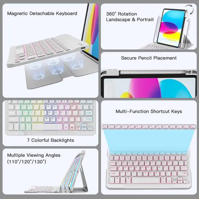 Colors: The magnetic detachable keyboard with 7-color backlight & 3-level brightness adjustment enjoy comfortable typing in any lighting condition. Featuring a row of shortcut keys for instant control, volume and brightness perfect companion for home, office, or travel.