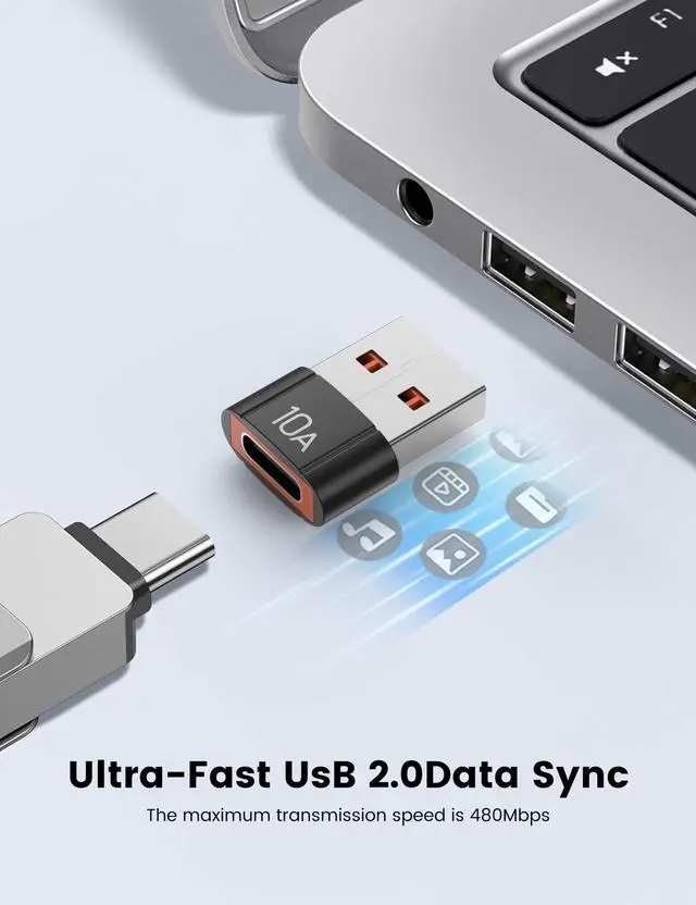 file transfer ^^ [Note]: This usbc to usb adapter is a USB 2.0 version and cannot transmit HDMI, VGA, or other video signals. That being said, they are fully capable of charging devices, copying files, and can seamlessly integrate with USB-C headphones, wireless network adapters, and SD card adapters. (Not compatible with Magsafe) ^^ [High Quality] This c to usb adapter is designed to enhance durability, featuring a sturdy aluminum alloy case material with excellent abrasion resistance and heat dissipation, and the USB male and female, and USB male and USB C female connectors are designed to be pluggable up to 20, 000 times.