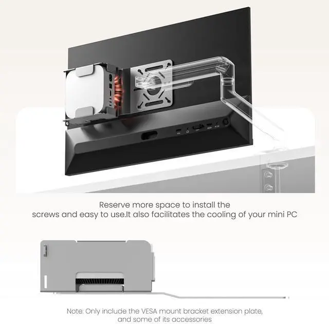 This VESA extension plate holder is used for mounting your mini PC or CPU on the back of your computer monitor. The mounted extender adapter uses the