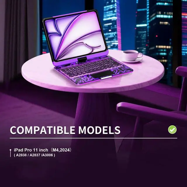 Precision Fit+Model Coverage Compatible only with iPad Pro 11-inch (M4/M5, 2024/2025), Please verify your iPads model number (starting with "A") on the back of your device before purchasing to ensure compatibility. If you are unsure about compatibility, feel free to contact uswe're happy to ass! ^^ High-Precision TouchpadEquipped with a multi-touch touchpad that responds instantly, it supports precise cursor control and a variety of gesture operations. It delivers a smooth notebook-level experience for text editing, web browsing, or media playback, significantly boosting productivity and creative expression. ^^ Multi-Angle Adjustable StandFeaturing a 360 rotating pivot and 189 hinge design, it supports suspension at any angle for quick switching between landscape and portrait modes across various scenarios.