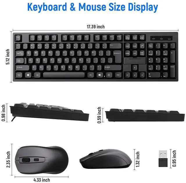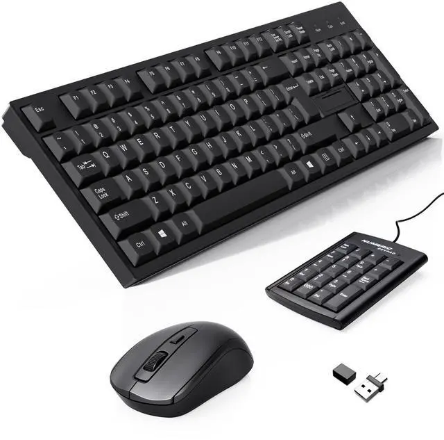 (Note: Keyboard and mouse are not silent) ^^ [USB Wired Numeric Keyboard] The mini size numeric keypad takes up little space and is very convenient to put in your bag or file pocket. It can help you input numbers more conveniently, handle spreadsheets, accounting documents, and finish your work faster. Supports almost all operating systems. Suitable for tax accounting calculations, office travel and home use. ^^ [Auto Power Saving Function] The wireless keyboard and mouse combo has an automatic power saving function. When you stop using the keyboard for more than 30 minutes and the mouse for more than 1 minute, they will enter sleep mode respectively to save power. This feature greatly extends battery life, and you can still move the device with the click of any button. [Batteries required (not included) ] 1 AA battery for the mouse and 1 AAA battery for the keyboard. )