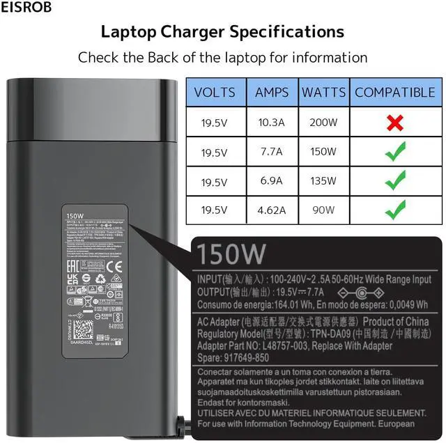 Compatible P/N: 150W 135W Power Adapter Fit for HP TPN-DA03 TPN-DA09 TPN-CA11 HSTNN-CA27 ADP-150XB B A150A05AL PA-1151-08HF W2F74AA W2F74UT#ABA Z5U90AV 3MD65AV Y1F28AV 917649-850 917677-003 917677-001 737737-001 737757-001 776620-001 75626-003 7645509-002 L32661-001 L15534-001 L48757-001 693709-001 693707-001 Replacement ^^ 4.