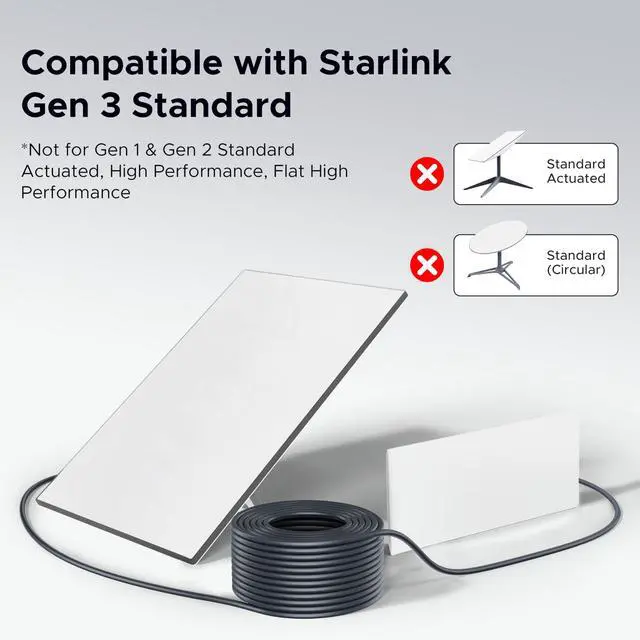 ^^ [Multiple Length Options to Meet Various Needs] Multiple length options for versatile applications. Ideal for use with your Starlink Gen 3 in various scenarios, including home use, RV camping, and during voyages. Perfect for changing the location of Starlink Gen 3 to suit your needs. You can easily adjust your Starlink to accommodate building height changes, prevent animal chewing, and avoid tree obstructions. ^^ [Compatibility] Compatible with Starlink Gen 3/V3/Standard. *Not compatible with Starlink Gen 1 & Gen 2 Standard Actuated, High Performance, Flat High Performance.