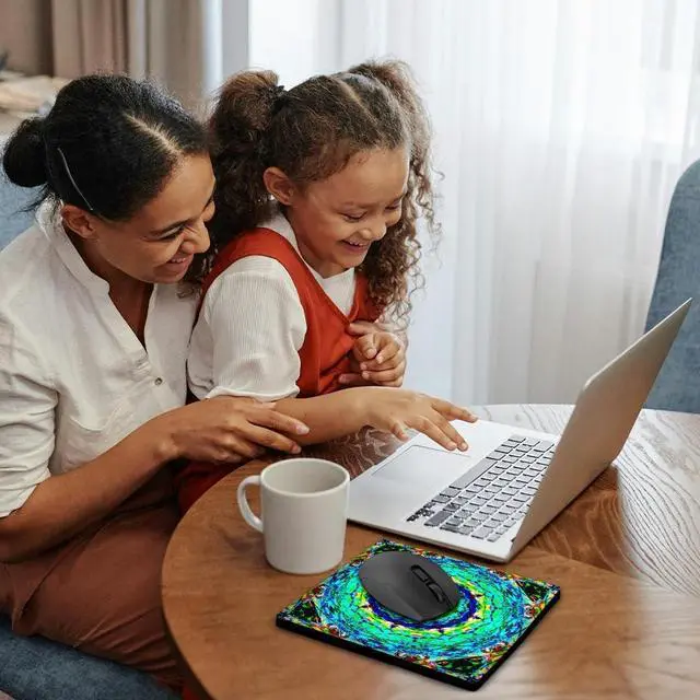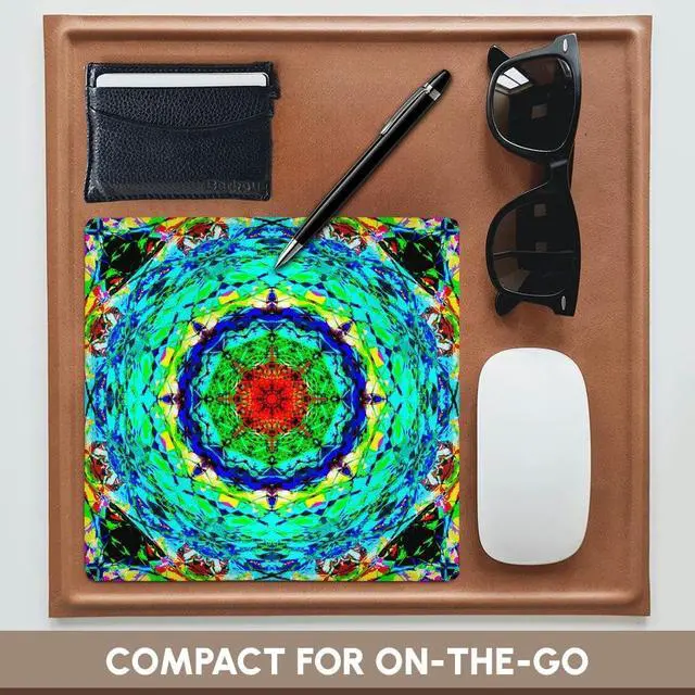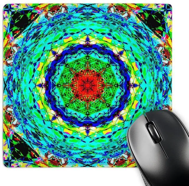 Blue Kaleidoscope bright and colorful symmetrical abstract design Mouse Pad is 8" x 8" x. 25" and is made of heavy-duty recycled rubber. Matte finish image will not fade or peel. Machine washable using a mild detergent and air dry.