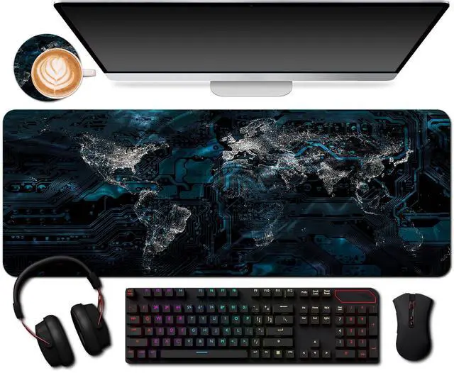 Hizelzidy Extended Mouse Pad with Cup Coaster for Computer and Keyboard31.5 X 11.8 inch Gaming Mouse Pad Desk Mat - Global City Lights World Map