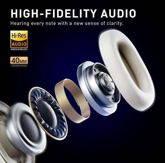 ANC & ENCProfessional active noise cancellation technology can isolate most of the noise. Whether you're on an airplane, on the subway, or in the office, over the ear headphones reduce surrounding noise to 43 decibels. You can also choose the intensity of the noise cancellation through the app, ensuring you an unrivaled listening experience. Also, the excellent ENC technology allows you to talk clearly even in noisy environments. ^^ 125 Hours PlaytimeThe bluetooth headphones over the ear have 90 hours of listening time in noise-canceling mode and up to 125 hours of playback time in normal mode.