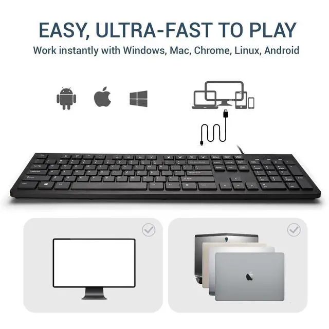 ^^ Wide Compatibility: The wired keyboard is fully compatible with Windows, Mac, Chrome, Linux, Android, and other systems, and works with desktop computers, laptops, tablets, and other devices.