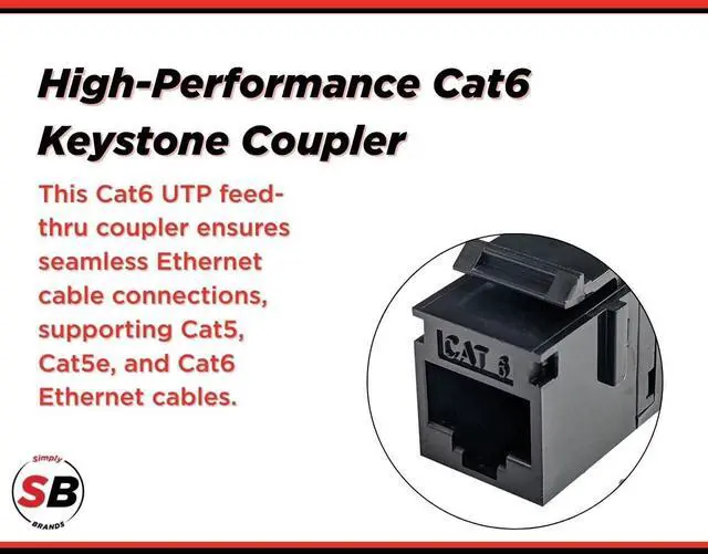 High-Performance Cat6 Keystone Coupler - This Cat6 UTP feed-thru coupler ensures seamless Ethernet cable connections, supporting Cat5, Cat5e, and Cat6 Ethernet cables for reliable networking. ^^ Slim Inline Design for Easy Installation - The compact Cat6 coupler fits RJ45 connectors, keystone wall plates, patch panels, and Ethernet couplers, ideal for home and office Ethernet setups. ^^ Certified for Industry Standards - Built to ANSI/TIA 568.2 -D and ISO/IEC 11801 Class E standards, ensuring high-speed data transmission and consistent Ethernet network performance. ^^ Supports S45 Snap-On ID Bars for Organization - Designed for structured cabling systems, this RJ45 keystone coupler allows for easy identification, improving network efficiency and maintenance.