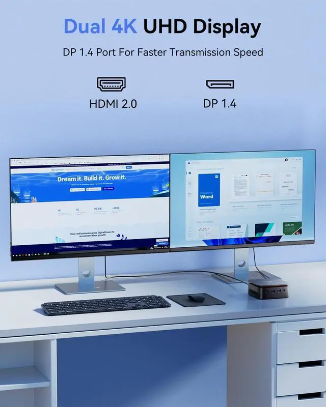 SSD: The KAMRUI Essenx E1 Mini Computer comes with 16GB DDR4 RAM (DDR4 SO-DIMM Slot1, up to 16GB) for seamless multitasking and efficient handling of memory-intensive applications. A 512GB M. 2 SSD (up to 2TB M. 2 PCIe 3.0 NVMe/SATA SSD) allows for quick system startup and application loading, storing a vast amount of data, documents, and multimedia files, providing ample space for your need ^^ Dual 4K Displays, Space-saving: The KAMRUI Essenx E1 N150 Mini PC is powered by Graphics up to 1.0 GHz Dynamic Frequency, 24 Units) to drive two stunning 4K displays via HDMI 2.0 and DP 1.4, perfect for immersive content creation. With the VESA wall mount, you can hang the E1 mini PC behind the monitors for a space-saving solution ^^