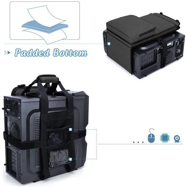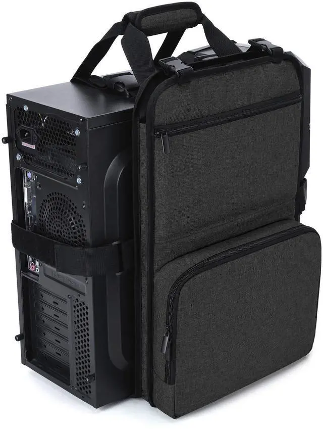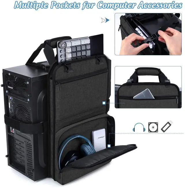 ^^ MULTIPLE POCKETS - There is a pocket with top buckle for keyboard and two zippered pockets to store your accessories like power supplies, adapters, external hard drives and etc. Two mesh pockets on the back to organize small items such as USB, SD cards, earphone and etc. ^^ EASY TO CARRY - With padded carrying handle, You will be able to carry your PC tower and the accessories by single hand instead of using both hands to hug the case, and get a lot easier to put it into your car.