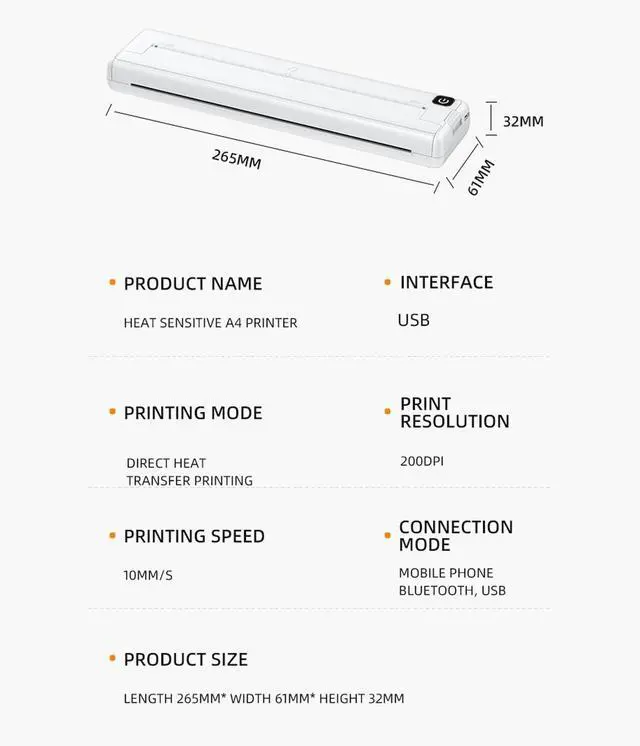 Size: Portable thermal printer supports A4 paper width for diverse printing needs.