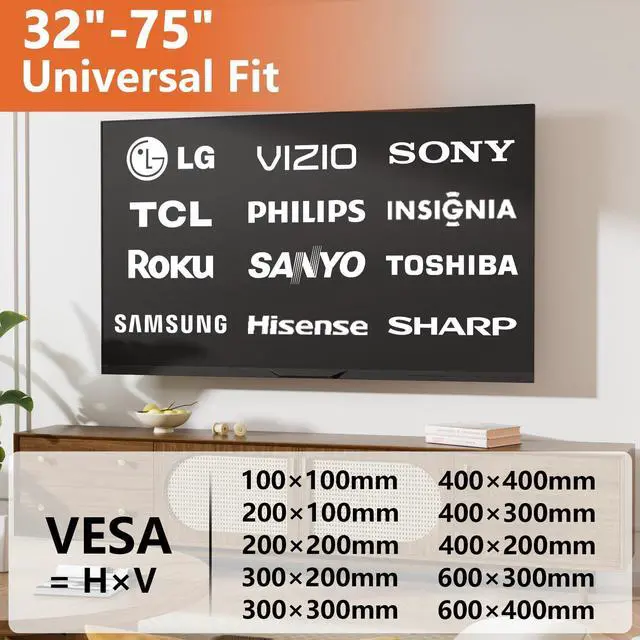 Universal TV Mount CompatibilityFulifix drywall TV mount is compatible with leading brands such as Samsung, LG, TCL, Vizio, Sony, Hisense, and Element. It has screen sizes ranging from 32-75 inches and fits most smart TV models on the market. ( TV wall mount up to 150 lbs max VESA 600400mm ^^ Easy InstallationNo drill tv mount comes with a detailed graphic installation guide and includes all installation parts. The TV mount does not require drilling or experience, and it only takes about 5 minutes and can be easily installed by one person ^^ No Studs or Drilling RequiredSay goodbye to studs and wall drilling! Studless tv wall mount requires no drilling and won't damage your drywall.