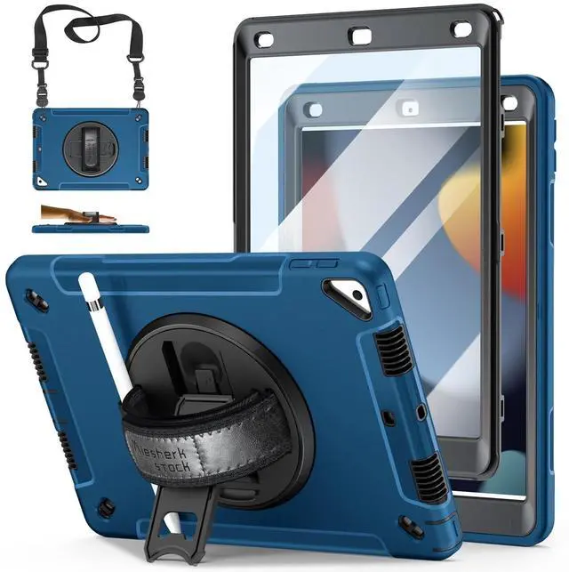MULTI-ANGLE KICKSTAND AND 360TURNTABLE: Case for ipad 9th/8th/7th Generation built-in bracket and turntable. Pick a perfect angle what you want. For watching videos, conferences, typing and drawing. Ideal for office workers, students, outdoor engineer or children ^^ ADJUSTABLE HAND STRAP +